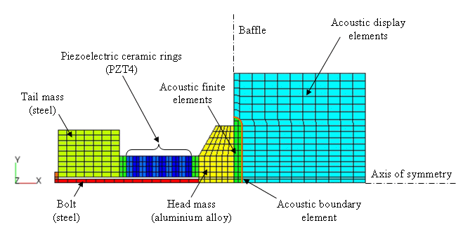 In this type of transducer, a piston is connected to a much heavier tail mass by some axially polarised ceramic rings, and with a connecting bolt running through the middle. An alternating voltage applied across the electrodes causes axial extension. The vibrating piston displaces the fluid causing energy to be radiated through the acoustic medium. At low frequencies the piston generally behaves in an "ideal rigid" manner. At higher frequencies "head flap" may occur. This is less efficient for radiating sound. The example below is axisymmetric, and radiates into a half space. It is sufficient to model the generator plane.